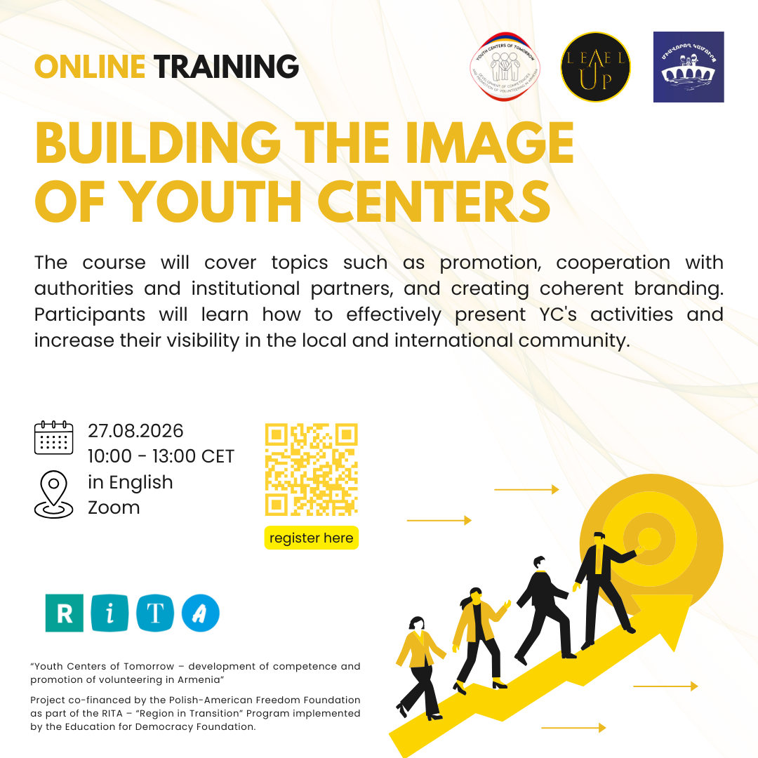 Ուրախությամբ տեղեկացնում ենք, որ «Youth Centers of Tomorrow – development of competence and promotion of volunteering in Armenia» ծրագրի շրջանակում նախատեսվում է 6 առցանց դասընթաց, որոնք միտված են երիտասարդական կենտրոնների զարգացմանը, նրանց կարողությունների ամրապնդմանը և Հայաստանում կամավորության խթանմանը։